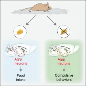 When the neurons that produce AgRP are stimulated in lab rodents, but they are not allowed to eat, foraging and displacement activities emerge instead. Activities such as excessive grooming, aimlessly digging and pointlessly burying stones, and obsessive running in their wheels.